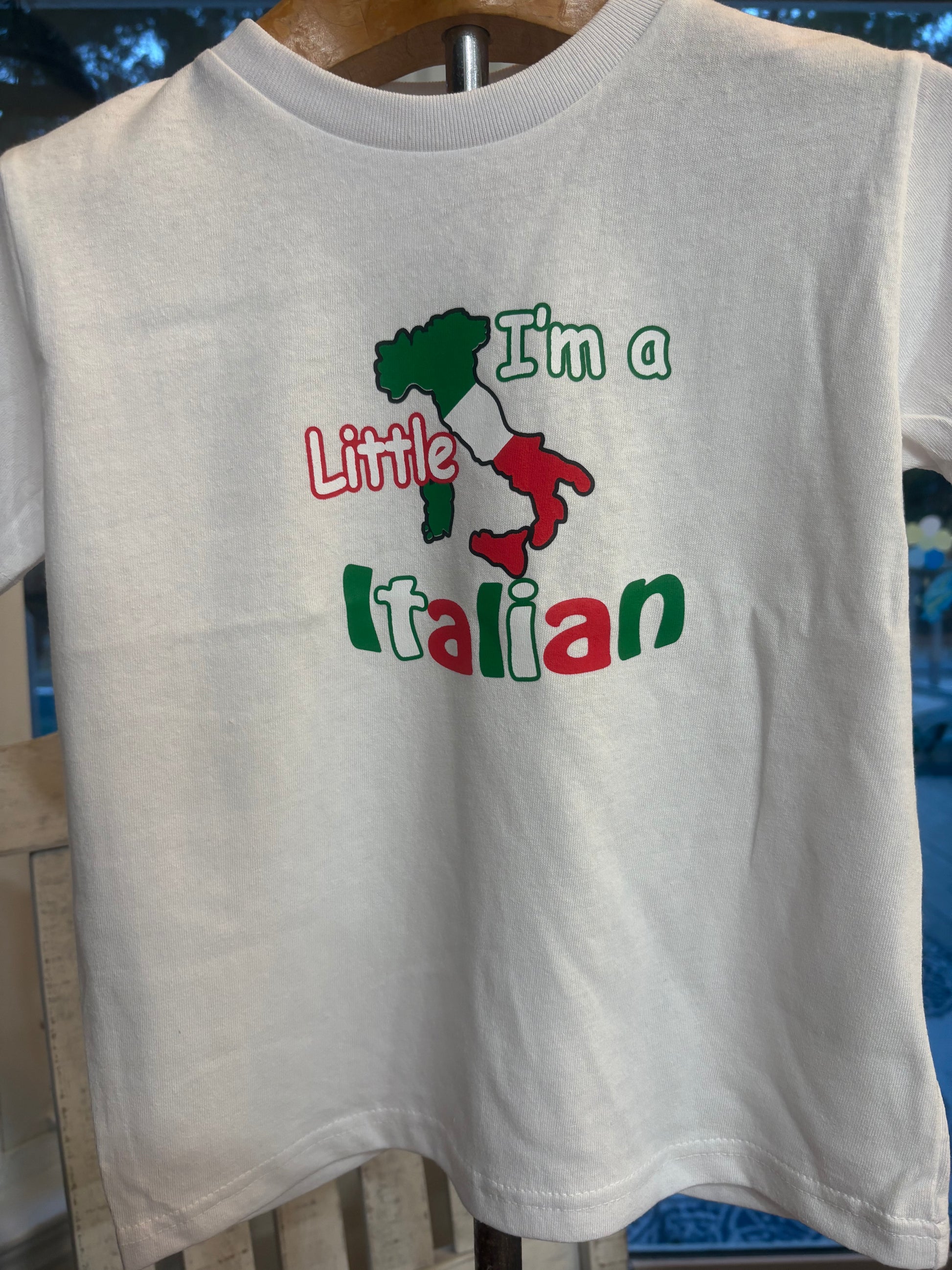 Celebrate Italian heritage with this charming youth t-shirt that features "I'm A Little Italian" playfully rendered in the vibrant colors of the Italian flag. The design is complemented by a whimsical graphic of Italy's iconic booth shape, also depicted in green, white and red, making it a delightful choice for young ones to showcase their cultural pride.